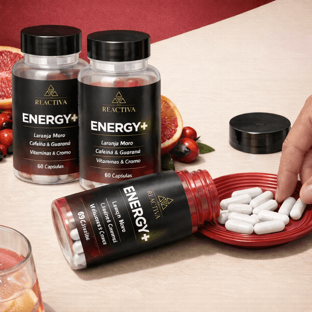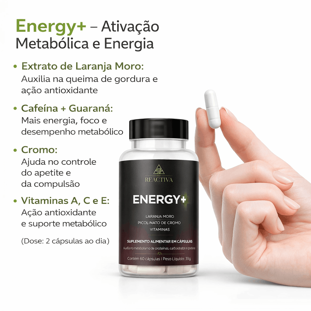 O Energy+ é um suplemento alimentar com cafeína, guaraná e micronutrientes que auxiliam no estado de alerta, no metabolismo energético e na proteção antioxidante.
