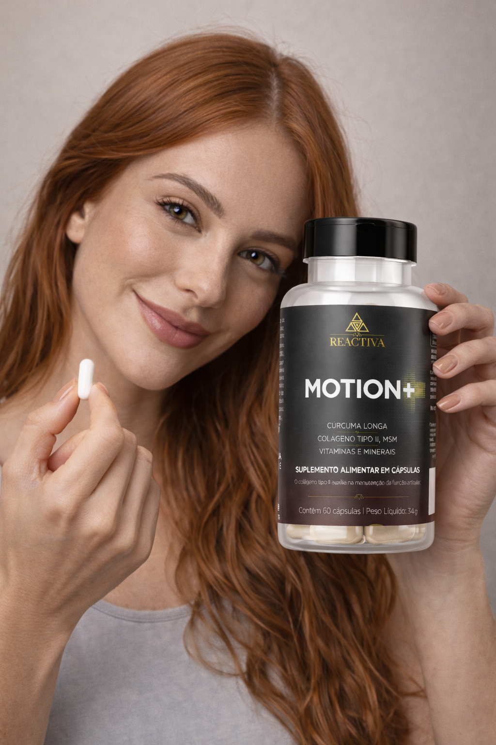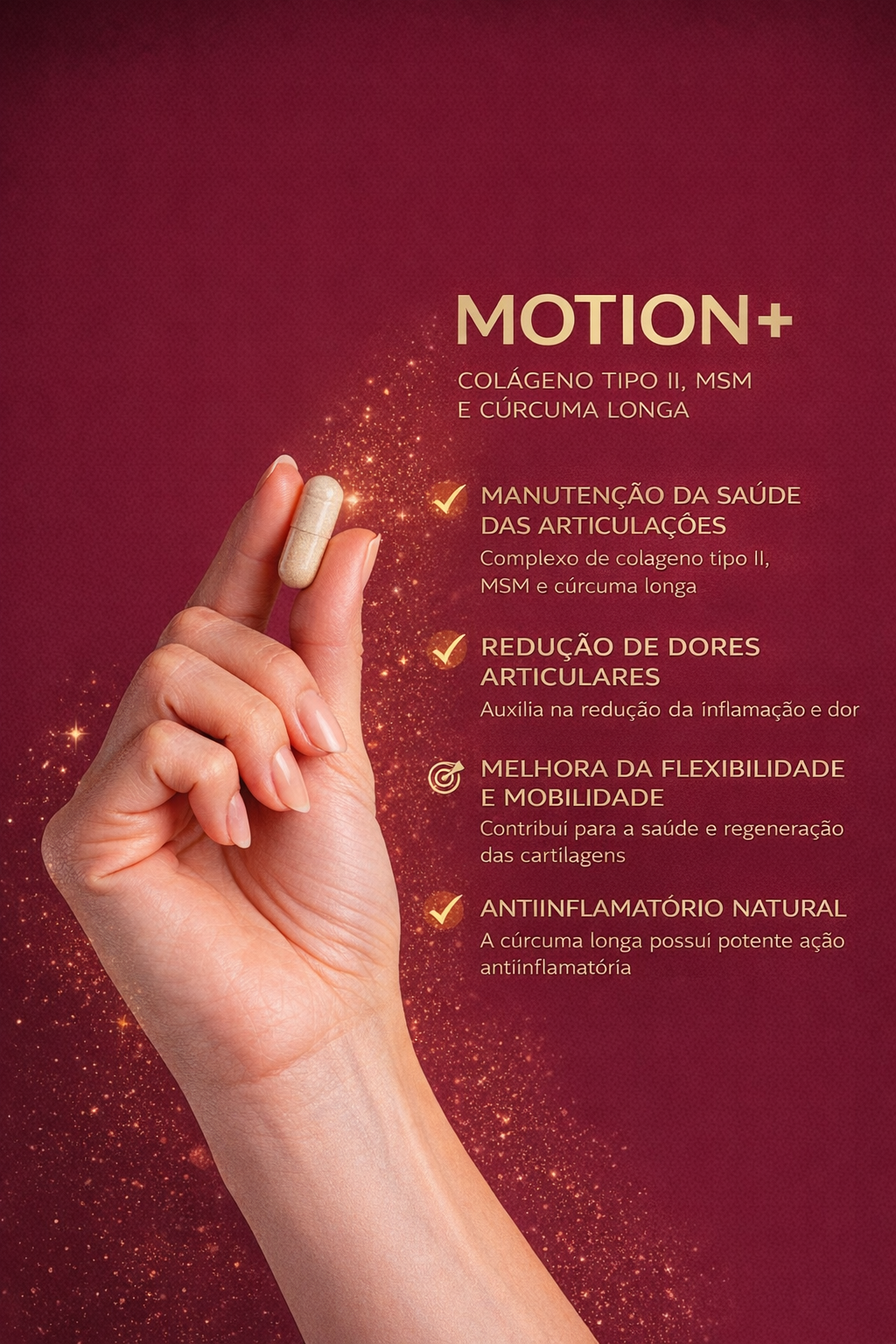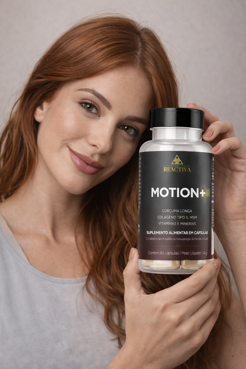 O Motion+ é um suplemento alimentar com vitamina D, vitamina K, colágeno tipo II, curcumina e MSM, pensado para complementar a rotina de quem quer preservar a saúde óssea, articular e a qualidade do movimento.